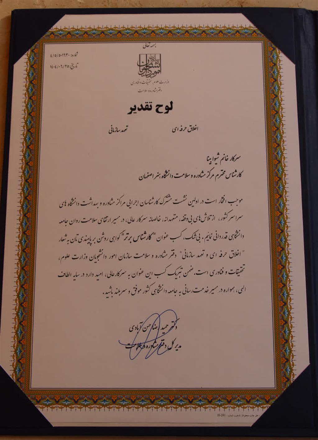 کارشناس مرکز مشاوره و سلامت دانشگاه هنر اصفهان، عنوان کارشناس برتر کشور را کسب کرد