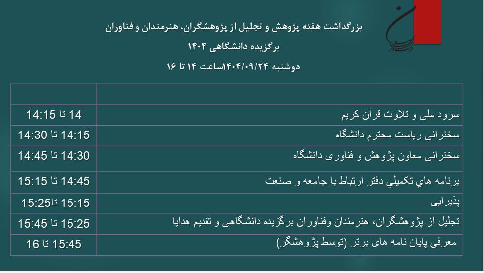 اعلام برنامه های مراسم پایانی جشنواره تجلیل از پژوهشگران، هنرمندان و فناوران برگزیده دانشگاهی 1404 برنامه مراسم پایانی